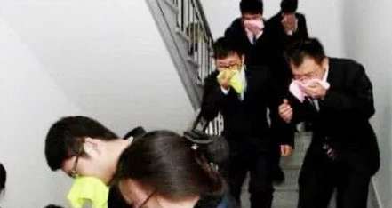 高楼着火,火焰向上蔓延的速度源远快于向下的速度。不论起火点在哪,都应沿着消防通道迅速往楼下跑。