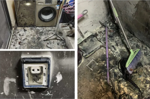 火灾现场火花四溅,伴随爆破声,非常吓人,幸好当时有人及时发现火情,林某发现电池着火后,带上玻璃门,让家人先撤离,又关掉电闸,物业保安也及时协助灭火。事故现场到处都是被火烧焦的痕迹,幸好火势没有蔓延,也幸好没有造成人员伤亡。